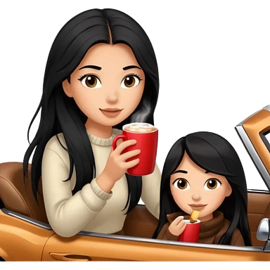 Tanned Girl with lashes , bright black long hair, in an extremely big fluffy brown mustang, and drinking hot chocolate drink emoji