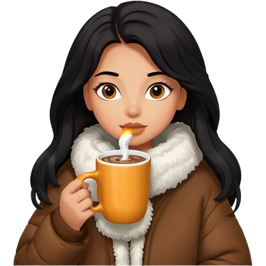 Tanned Girl with lashes , black hair, in an extremely big fluffy oversized jacket, and drinking hot chocolate drink emoji