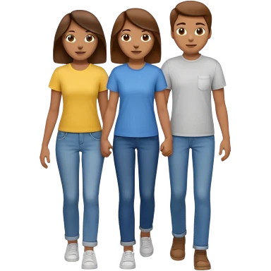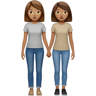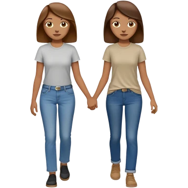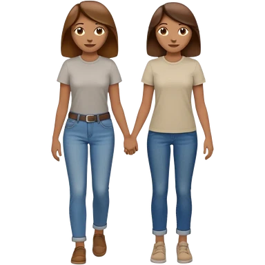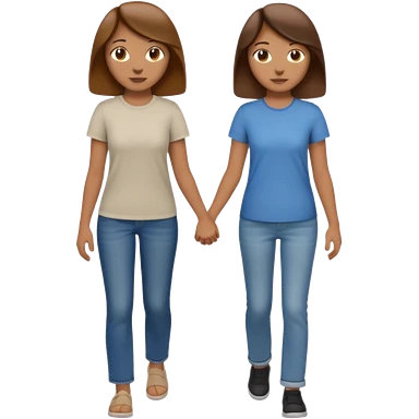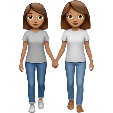 based on emoji style, two people walking together. one is brown-haired woman, wearing a shirt, Another one is a non-binary person, wearing t shirt and jeans, and the second person doesn't have anything on their hands. They are not holding hands emoji
