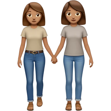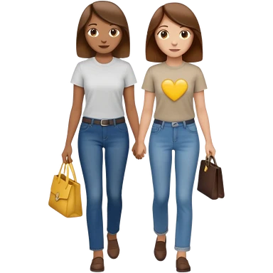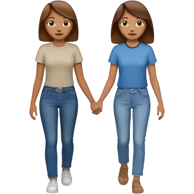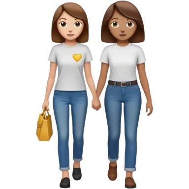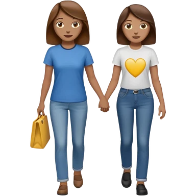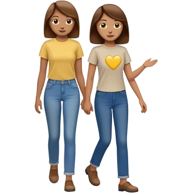 based on emoji style, two people walking together, They are not holding hands. one is brown-haired woman, wearing a shirt, Another one is a non-binary person, wearing t shirt and jeans, and the second person doesn't have anything on their hands. emoji