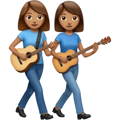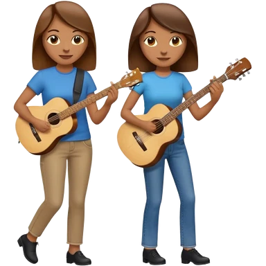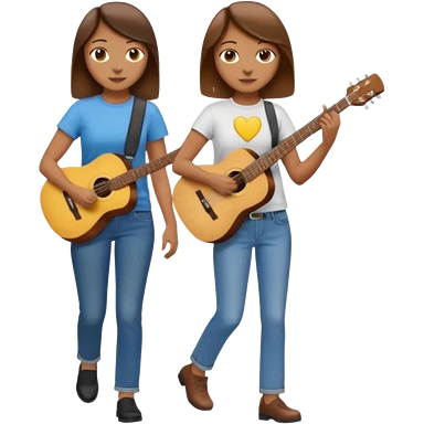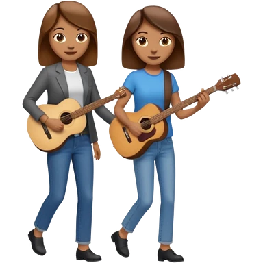 based on emoji style, two people walking together. one is brown-haired woman, wearing business casual, holding a guitar. Another one is a non-binary person, wearing t shirt and jeans, and the second person doesn't have anything on their hands. emoji