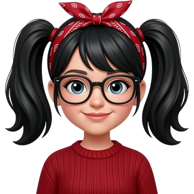 Emoji of a girl with two black pigtails, a red bandana, a dark red sweater and black glasses emoji