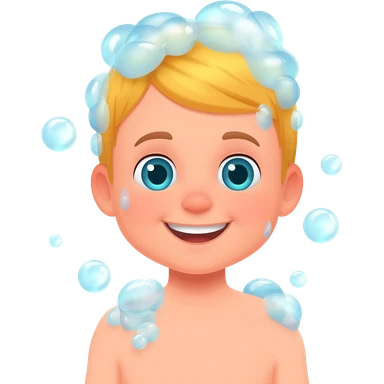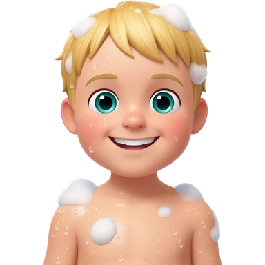 Create an emoji of a blonde 3 year old happy boy with blue-greenish eyes taking a shower and add bubbles emoji