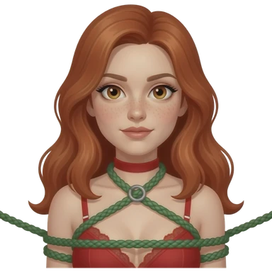Light skin with freckles, long red hair, hazel eyes submissive, bound in green rope emoji