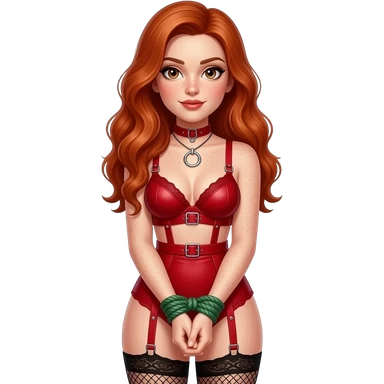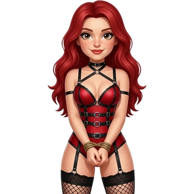 Light skin with freckles, long red hair, hazel eyes Dominatrix, wearing BDSM style red harness lingerie and black fishnet stockings. Hands bound emoji