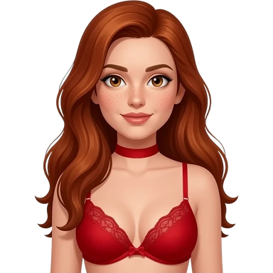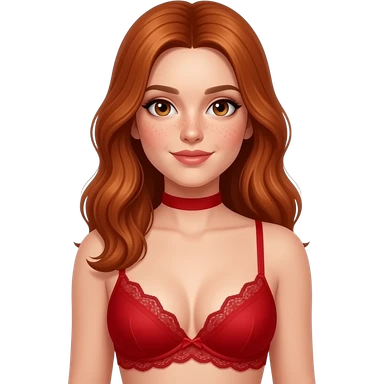 Light skin with freckles, long red hair, hazel eyes, wearing red lingerie, plain red collar. submissive pose emoji