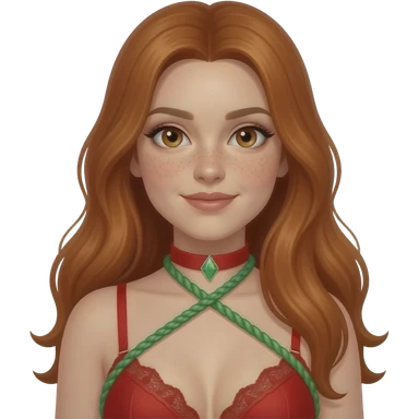 Light skin with freckles, long red hair, hazel eyes, wearing red lingerie, red collar, and green rope hishi karada emoji