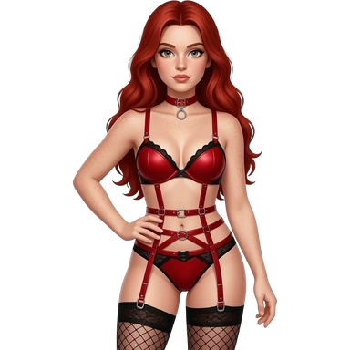 Light skin with freckles, long red hair, hazel eyes Dominatrix, wearing BDSM style red harness lingerie and black fishnet stockings. Dominant pose. emoji