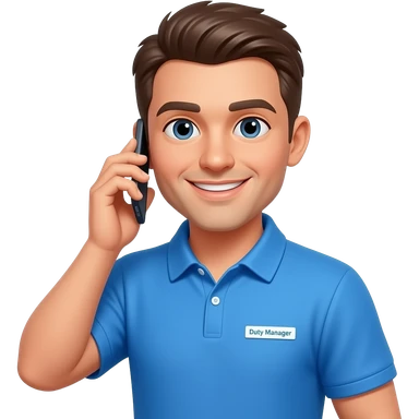 male Duty Manager, blue polo shirt, smiling with mobile phone emoji