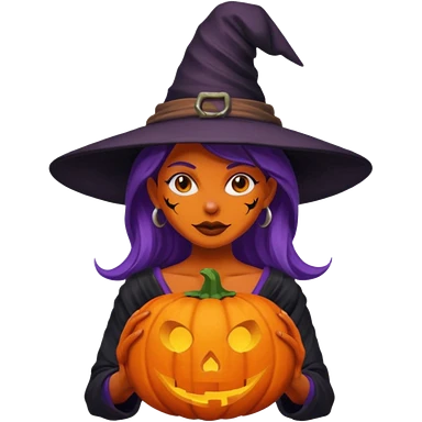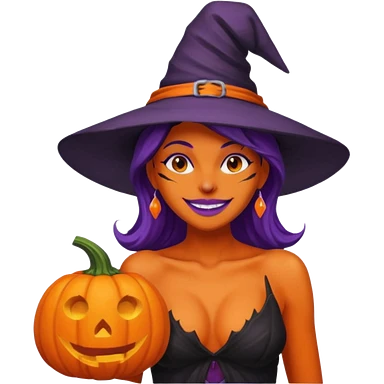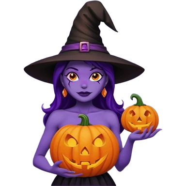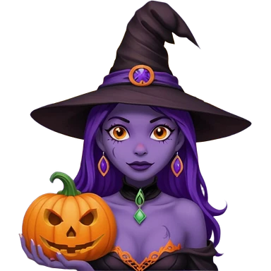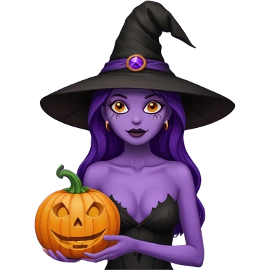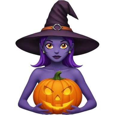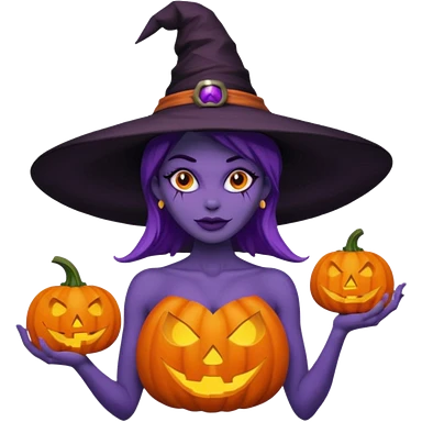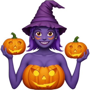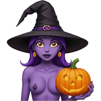 A naked woman with bare chest wears a carved pumpkin head and a witch hat with purple skin emoji