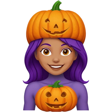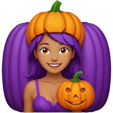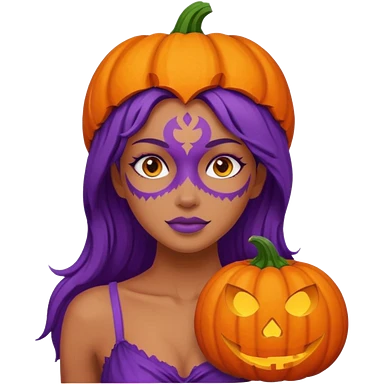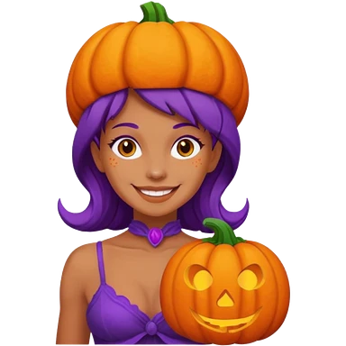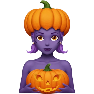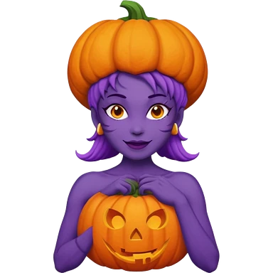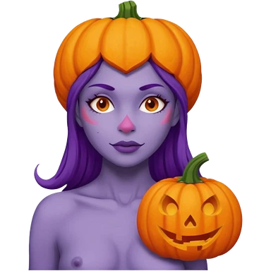 A nude woman with bare chest and wears a carved pumpkin on its head with purple skin emoji
