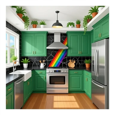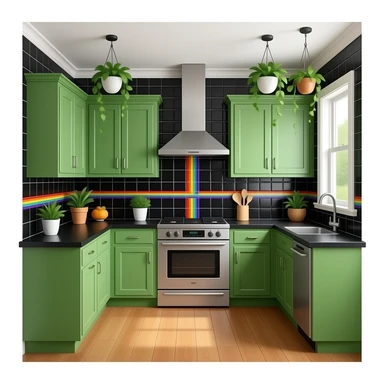 fancy kitchen with black wall tiles with rainbow tile lines, kelly Green cabinets, black countertops, wood floors and decorative plants on the ceiling emoji