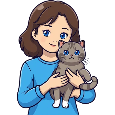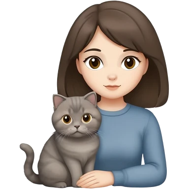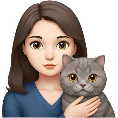 Girl with blue eyes and brown hair holding a medium fluffy grey Scottish fold cat emoji