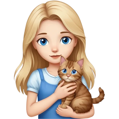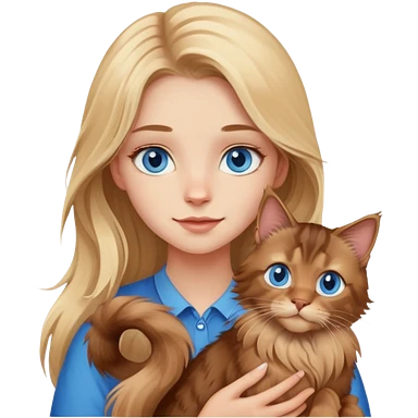 A blonde blue eyes girl holds a brown Maine Coon cat in her arms emoji