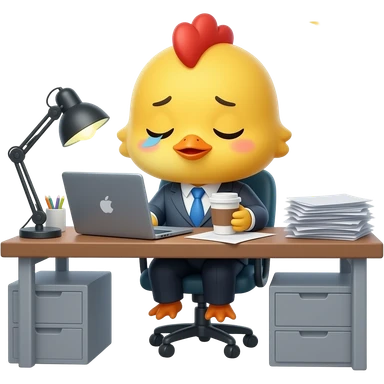 adorable yellow baby chick junior office worker, wearing a tiny suit and tie, working late at night at a desk, sleepy eyes, holding coffee, laptop and paperwork around, determined but tired expression, cute emoji style, simple shapes, pastel colors, transparent background emoji