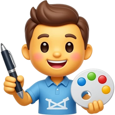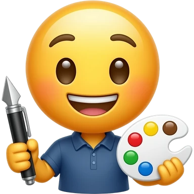cute emoji designer character, holding pen tool and color palette, creative workspace vibe, minimal emoji style emoji