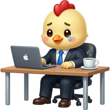 cute baby chick office worker wearing suit and tie, working late at night with laptop and coffee, tired expression, minimal emoji style emoji