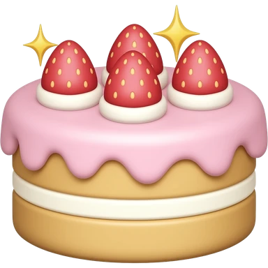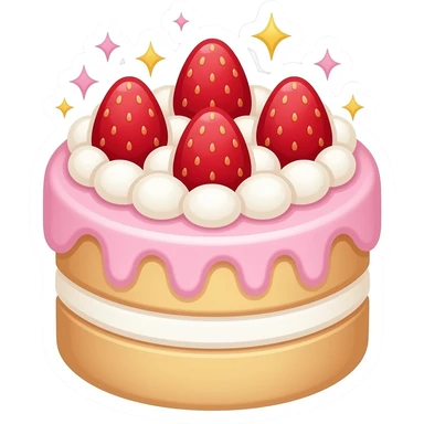 cute pastel celebration cake emoji, beautiful layered cake with pink cream frosting, strawberries and sparkles on top, kawaii dessert style, soft pastel colors, simple emoji design, sticker style, transparent background emoji