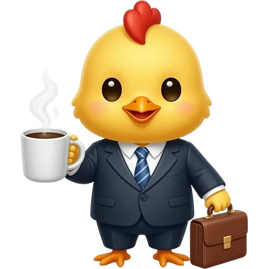 cute yellow baby chick in a business suit and tie, first day at work, holding a coffee cup and briefcase, emoji style emoji