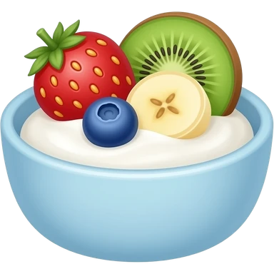 cute greek yogurt bowl emoji, creamy greek yogurt in a small bowl with colorful fruits on top like strawberry, blueberry, banana and kiwi, pastel colors, kawaii style, simple emoji design, sticker style, transparent background emoji