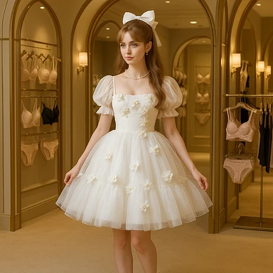 A sweet princess with long hair, fair skin, high forehead, styled in a princess updo with a bow, half-draped, wearing a white suspender puffy tulle Lolita dress with puff sleeves, tube top, and a light multi-layer tulle skirt, decorated with flowers, pearl necklace and earrings, white lace-up high heels, standing in a store filled with exquisite lingerie, golden arch decorations, and soft lighting, 8k, high definition, full body, long shot, 1:1 ratio, various angles. emoji